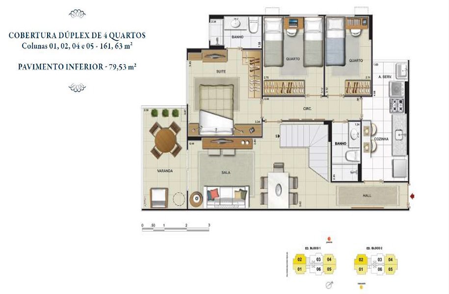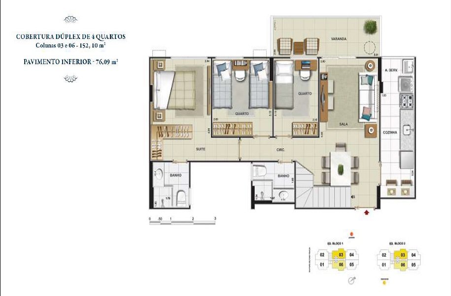| Cobertura Duplex | R$ 1.068.200,00 | 161 m² | 161 m² | 4 | 1 | 4 | 3 |
