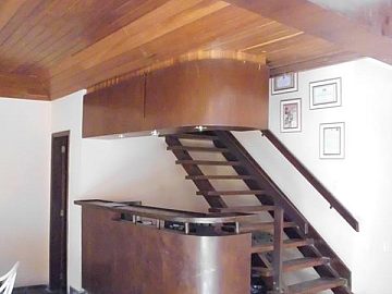 No primeiro piso, um salão vasto convida à convivência ou à criação de uma recepção impactante. A escada em madeira maciça é o ponto focal que leva ao segundo andar, onde um salão espelhado amplia a luminosidade natural. Ao todo, são 5 quartos (ou salas privativas) distribuídos de forma funcional.